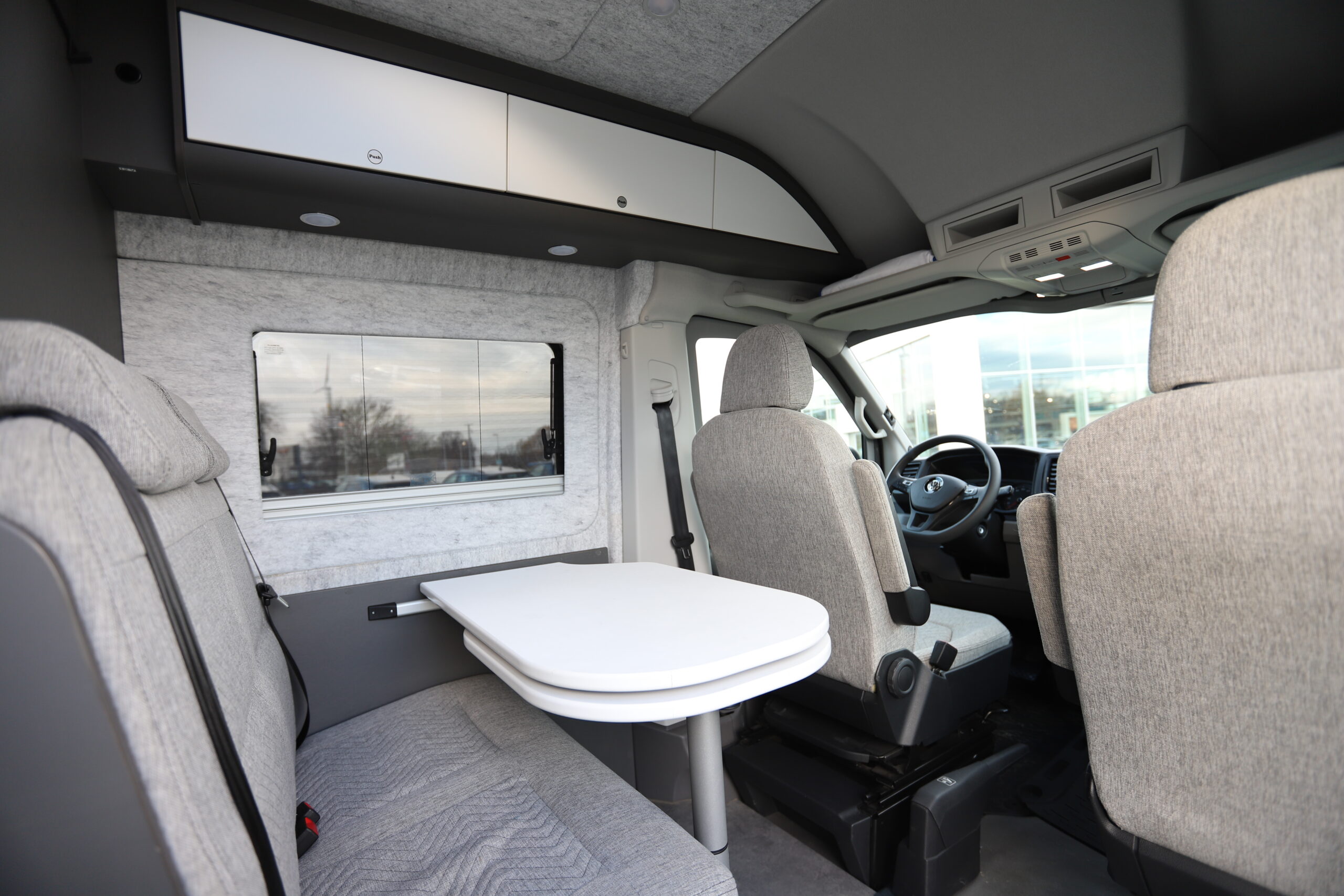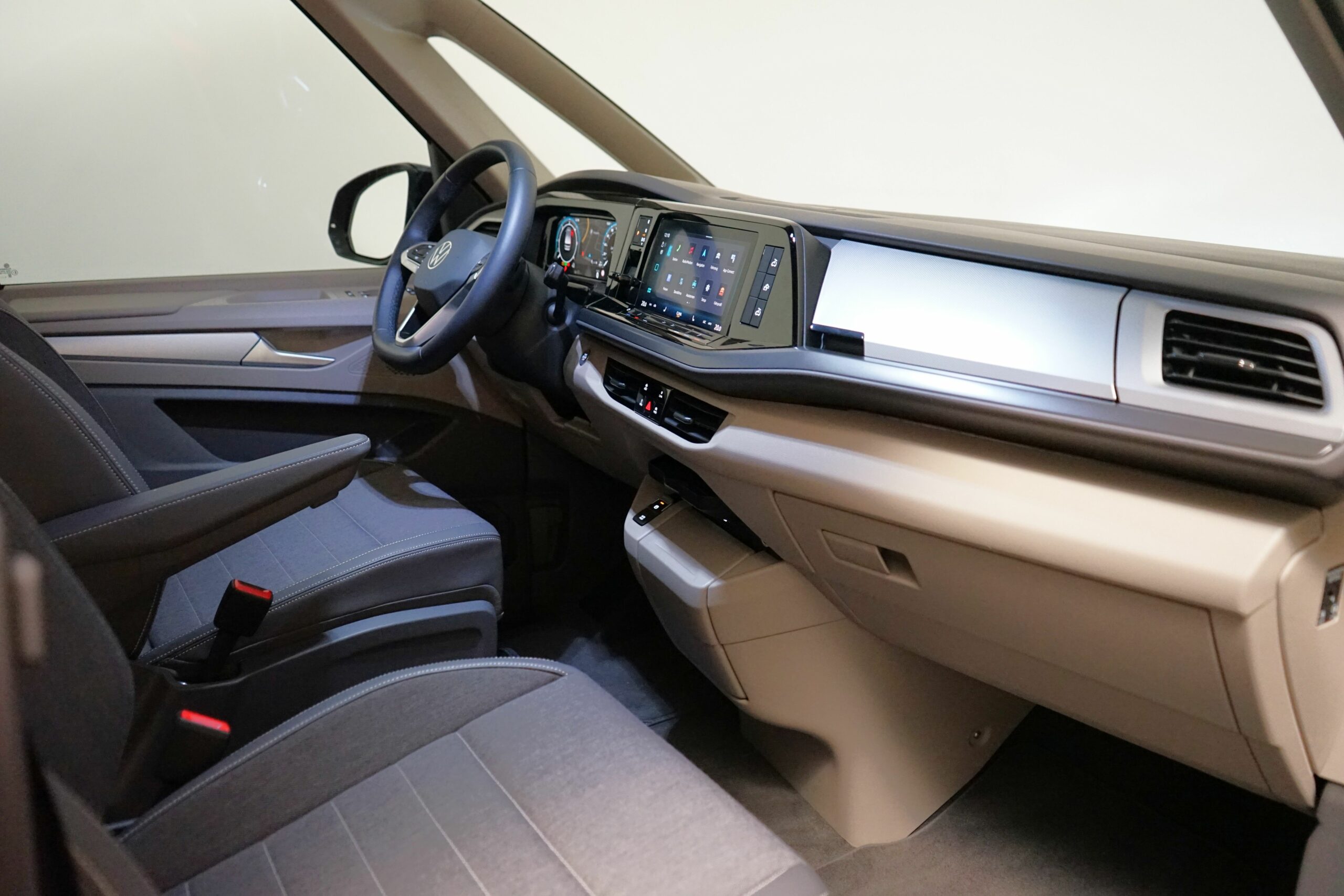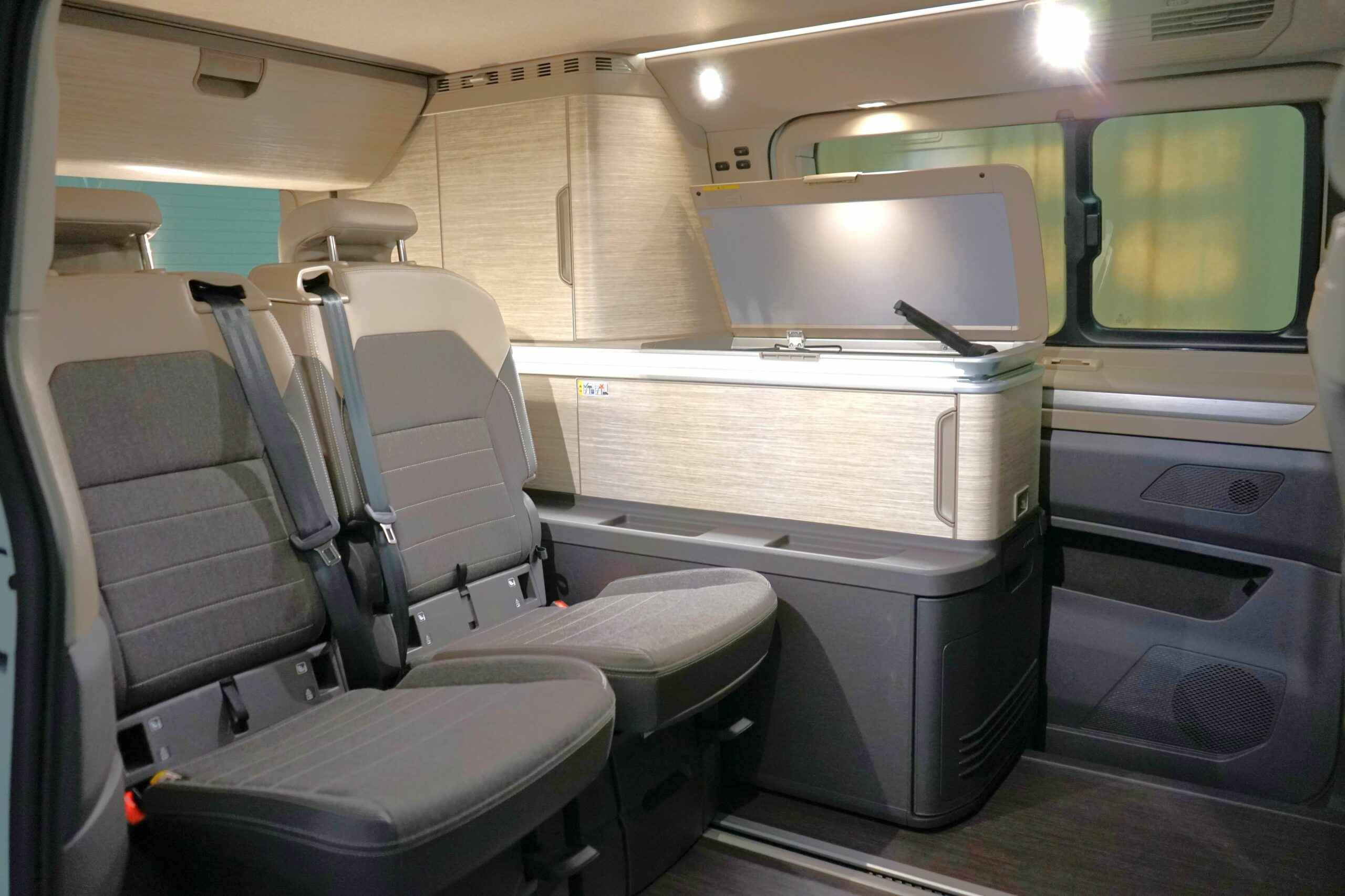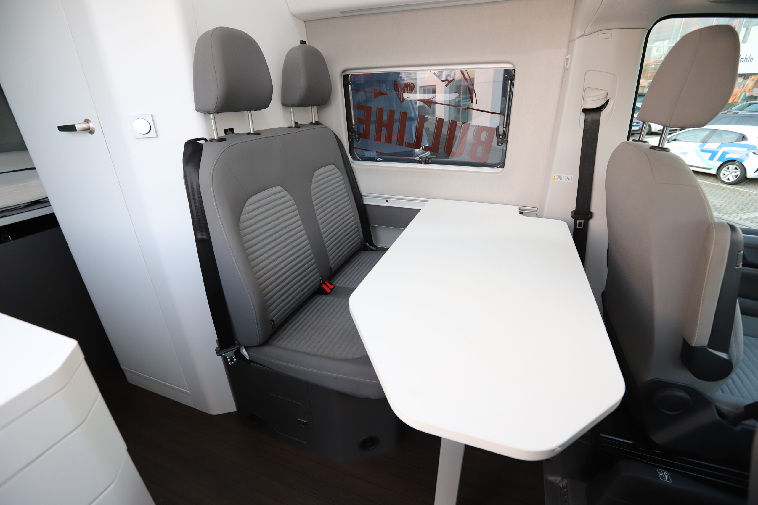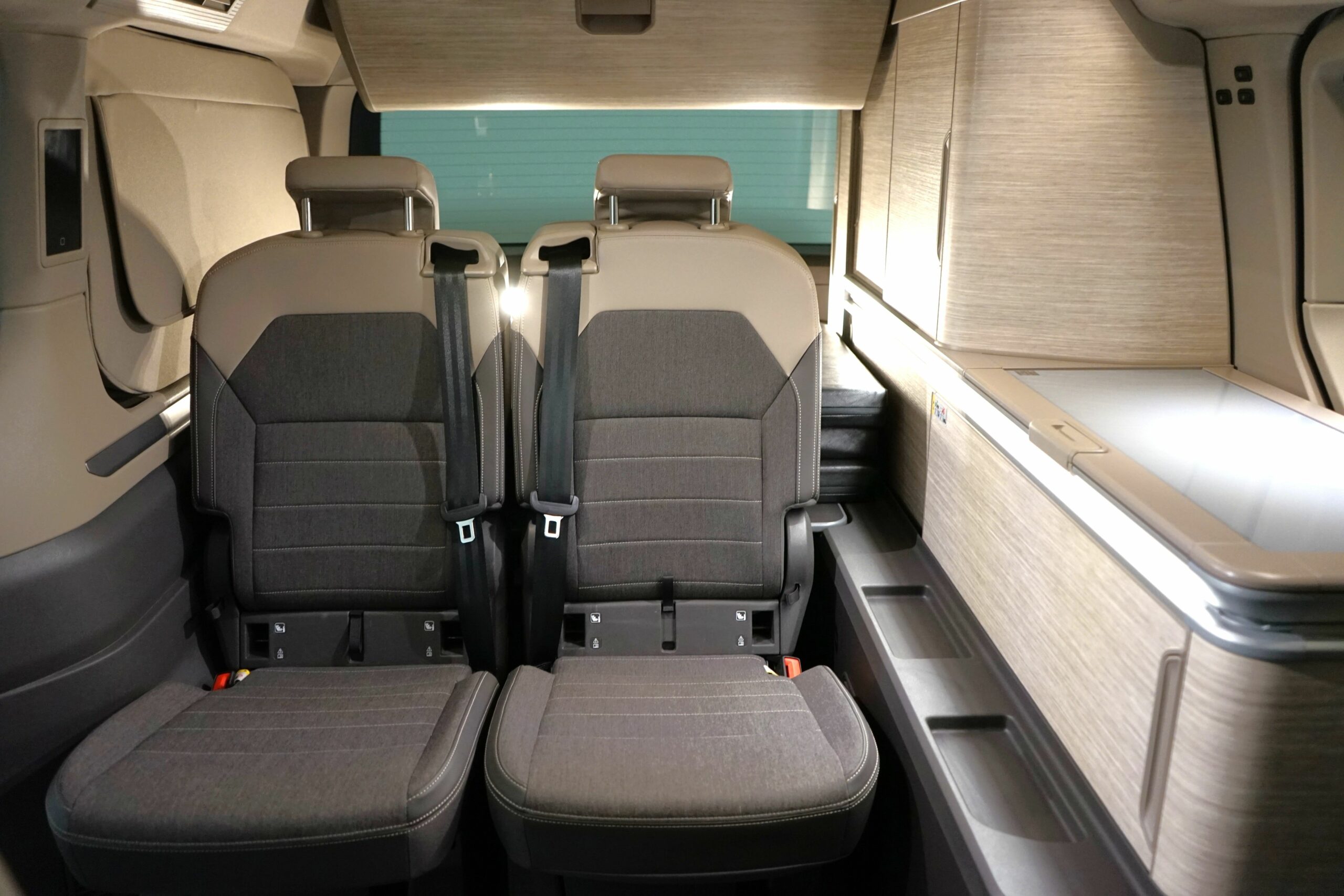 Mit seinen 4 Sitzplätzen & Schlafplätzen sowie den drehbaren Vordersitzen schafft der Bulli eine gemütliche Camper-Wohnraumatmosphäre.