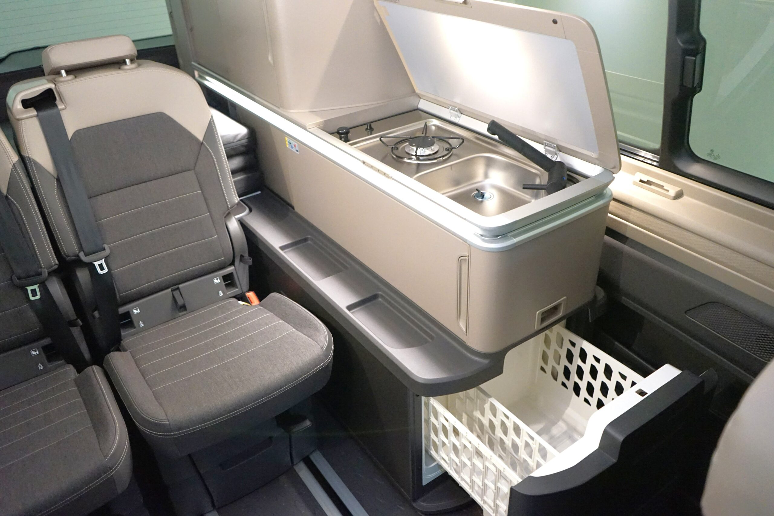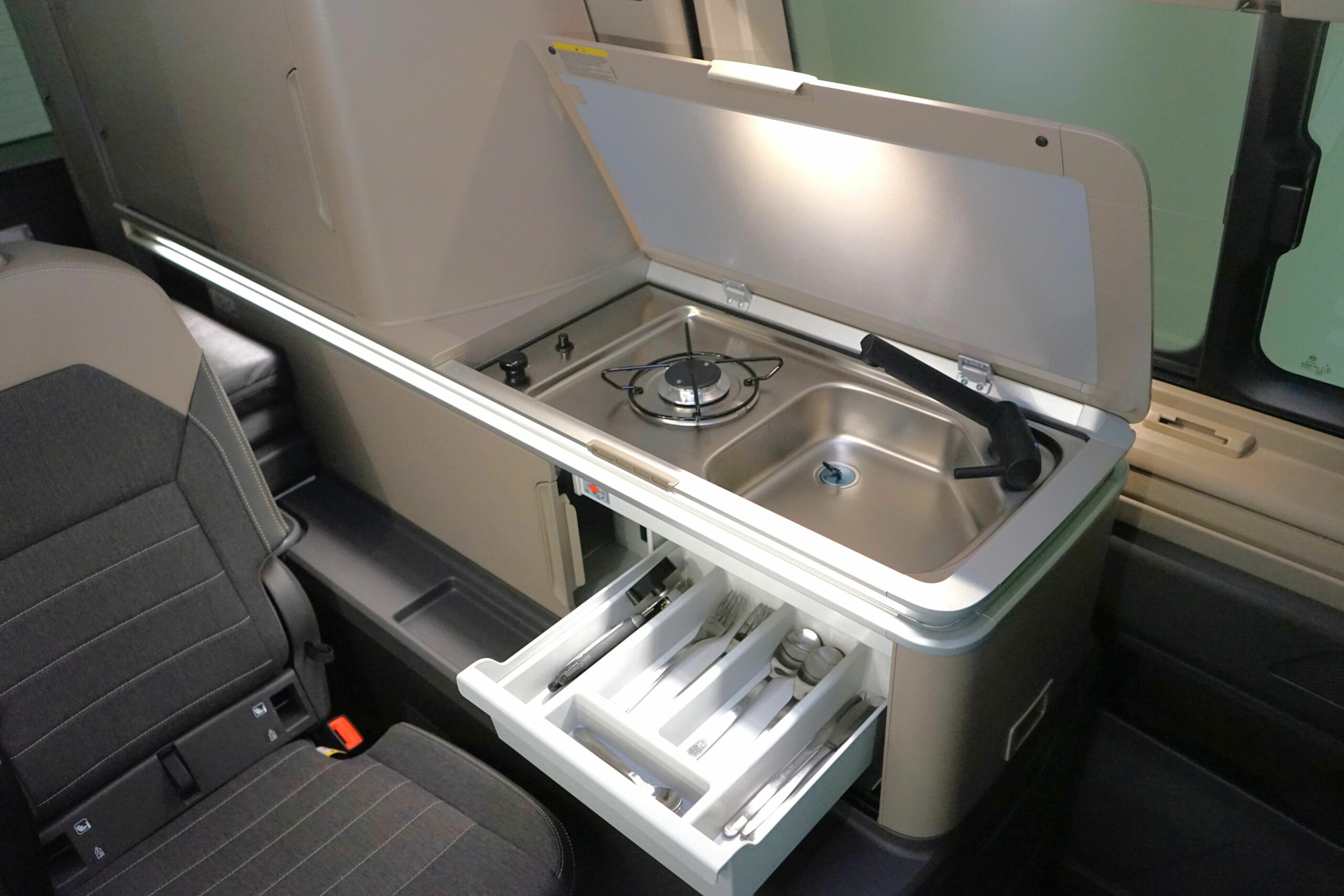 Unser California Ocean „FerienGefährte“ bietet dir eine komfortable Ausstattung mit einer vollwertigen Küchenzeile inklusive Gaskochfeld und einem Außenklapptisch, die zum herzhaften Kochen einlädt.