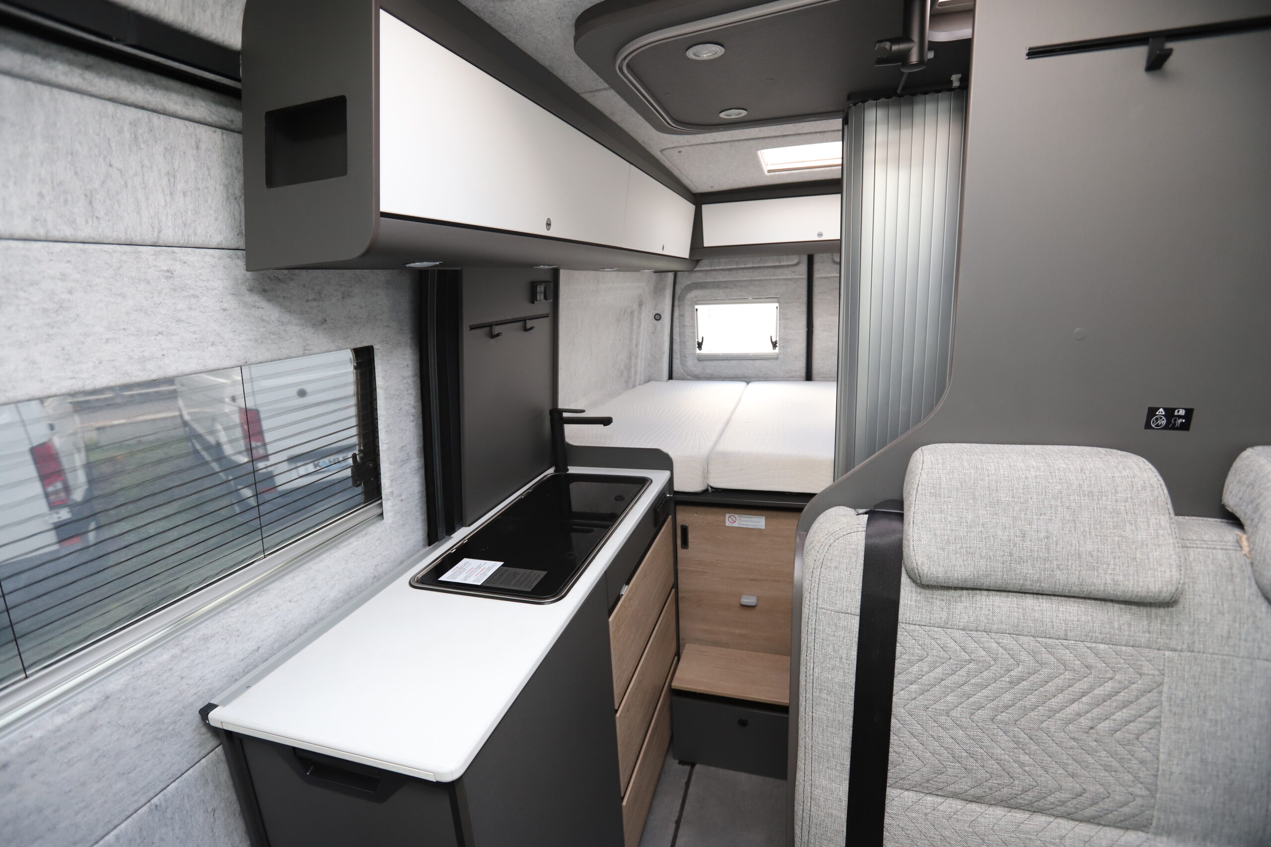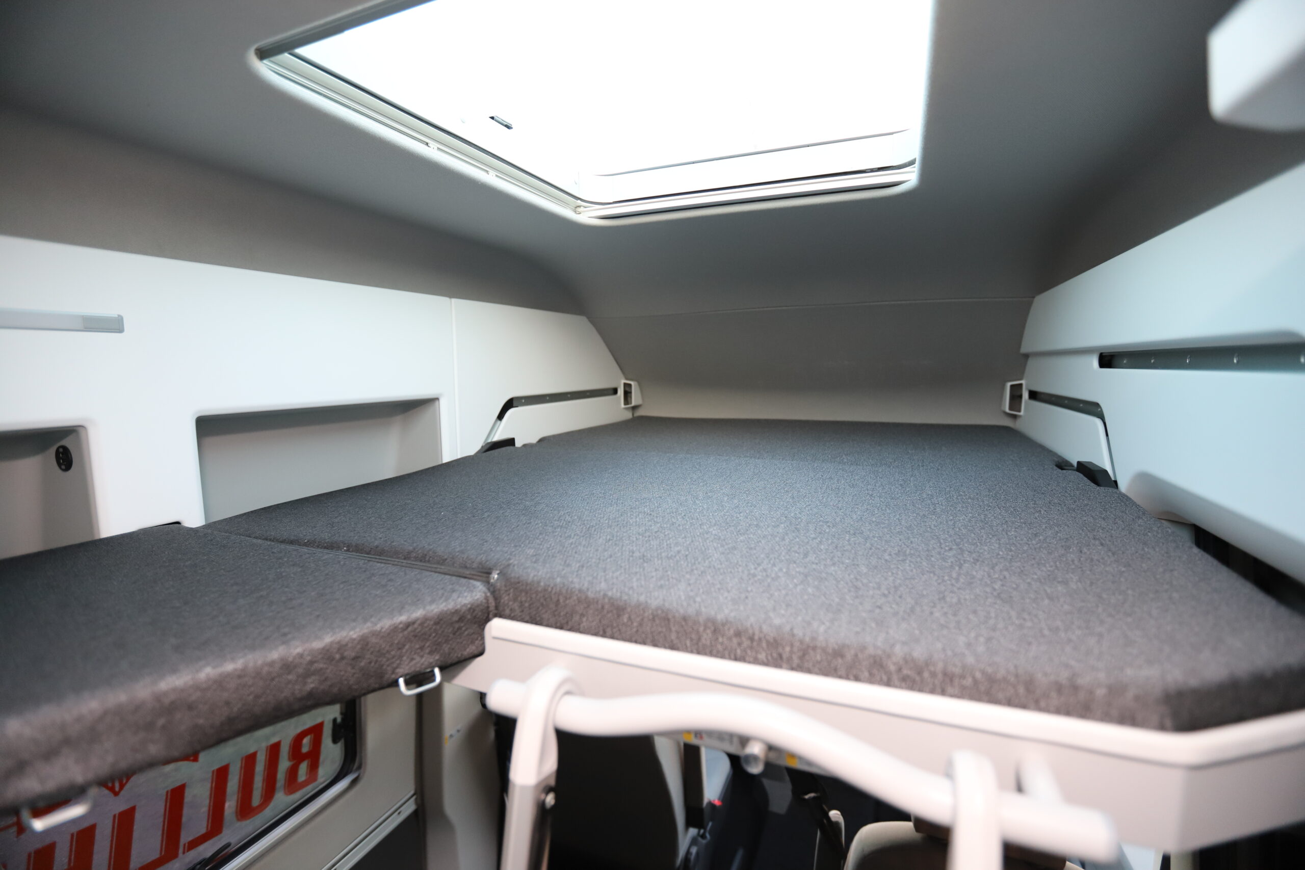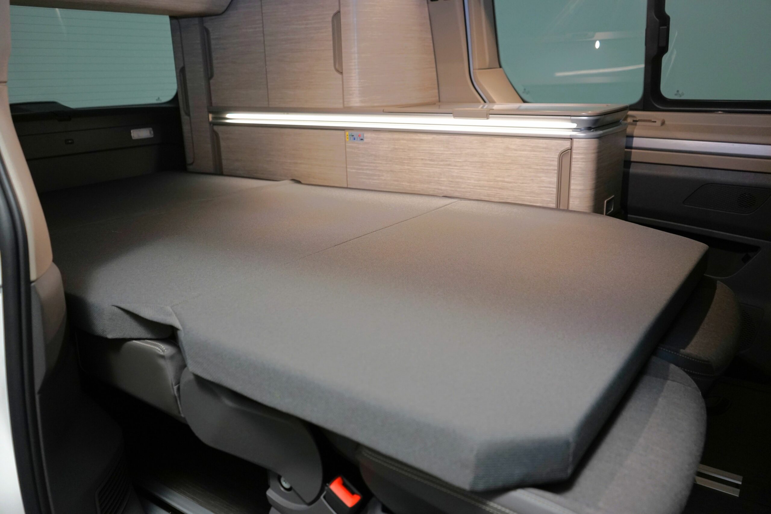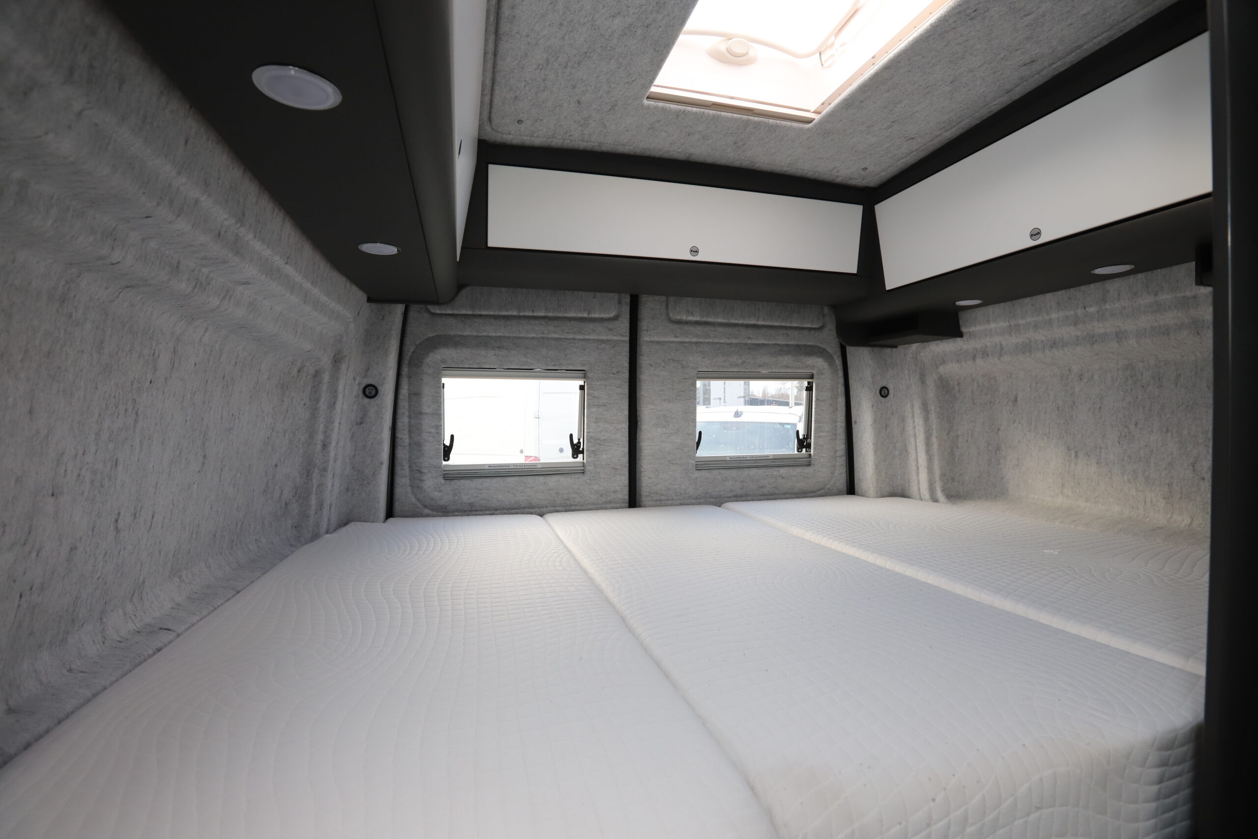 Die individuelle Filzwandverkleidung sorgt für ein angenehmes Raumklima und schalldämmend für angenehme Camper Abende.