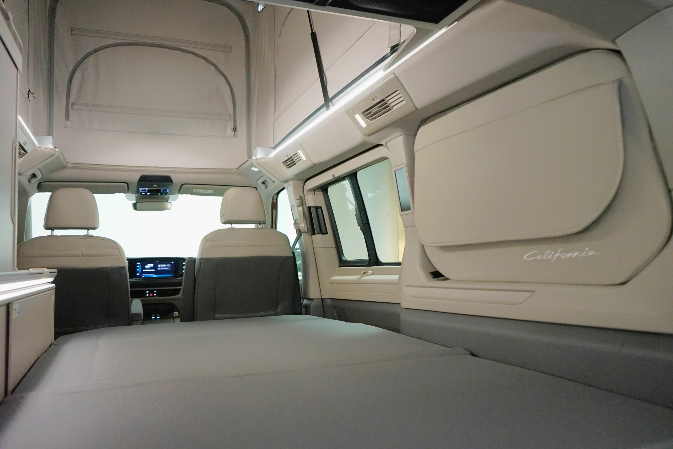 Und das Beste: Mit dem elektrohydraulischen Aufstelldach verwandelst du deinen Bulli im Handumdrehen in ein Schlafzimmer unter Sternen – Platz für bis zu vier Personen inklusive.