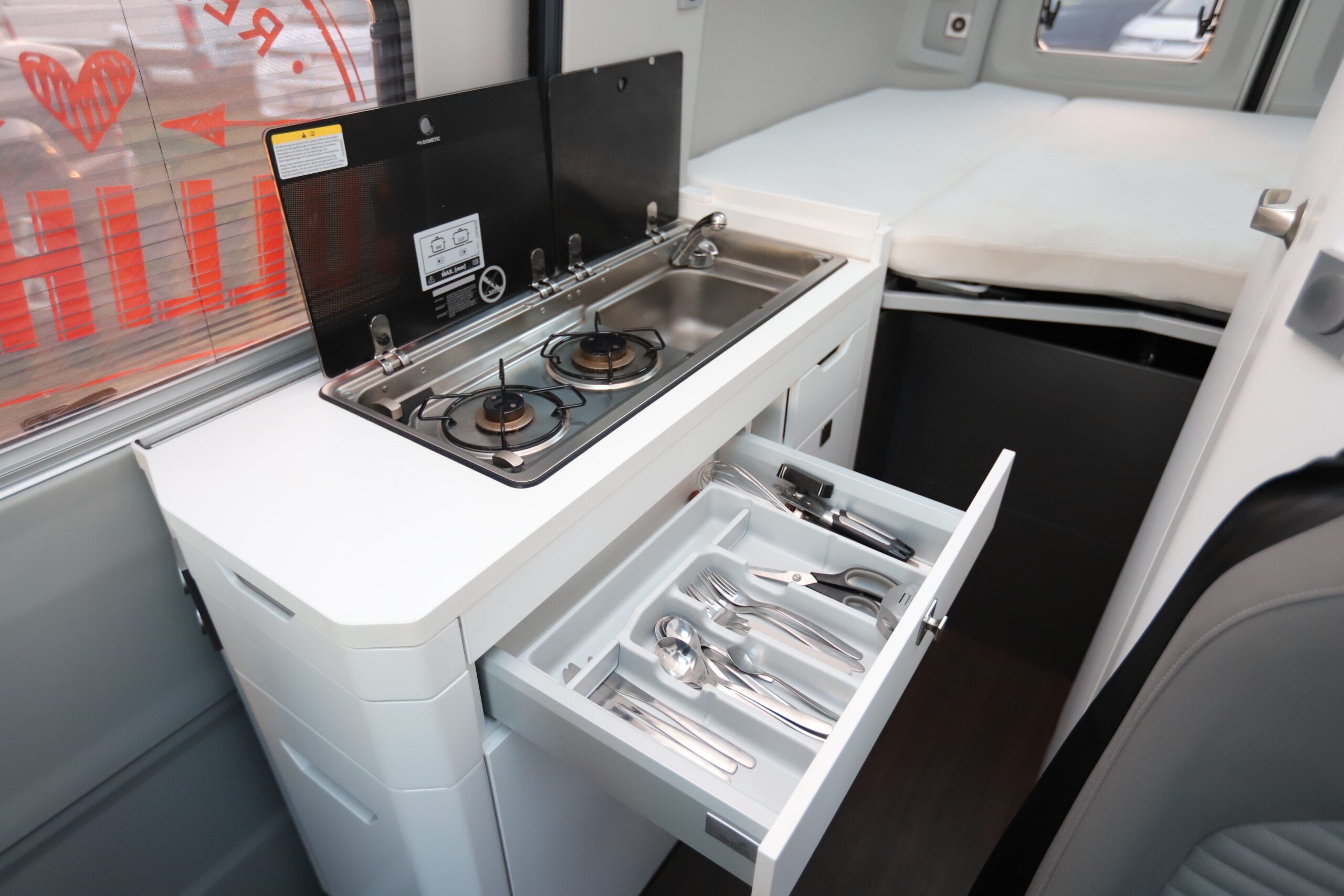 In allen BULLI HERZ-Campern findet ihr eine Camping-Grundausstattung, bestehend aus: